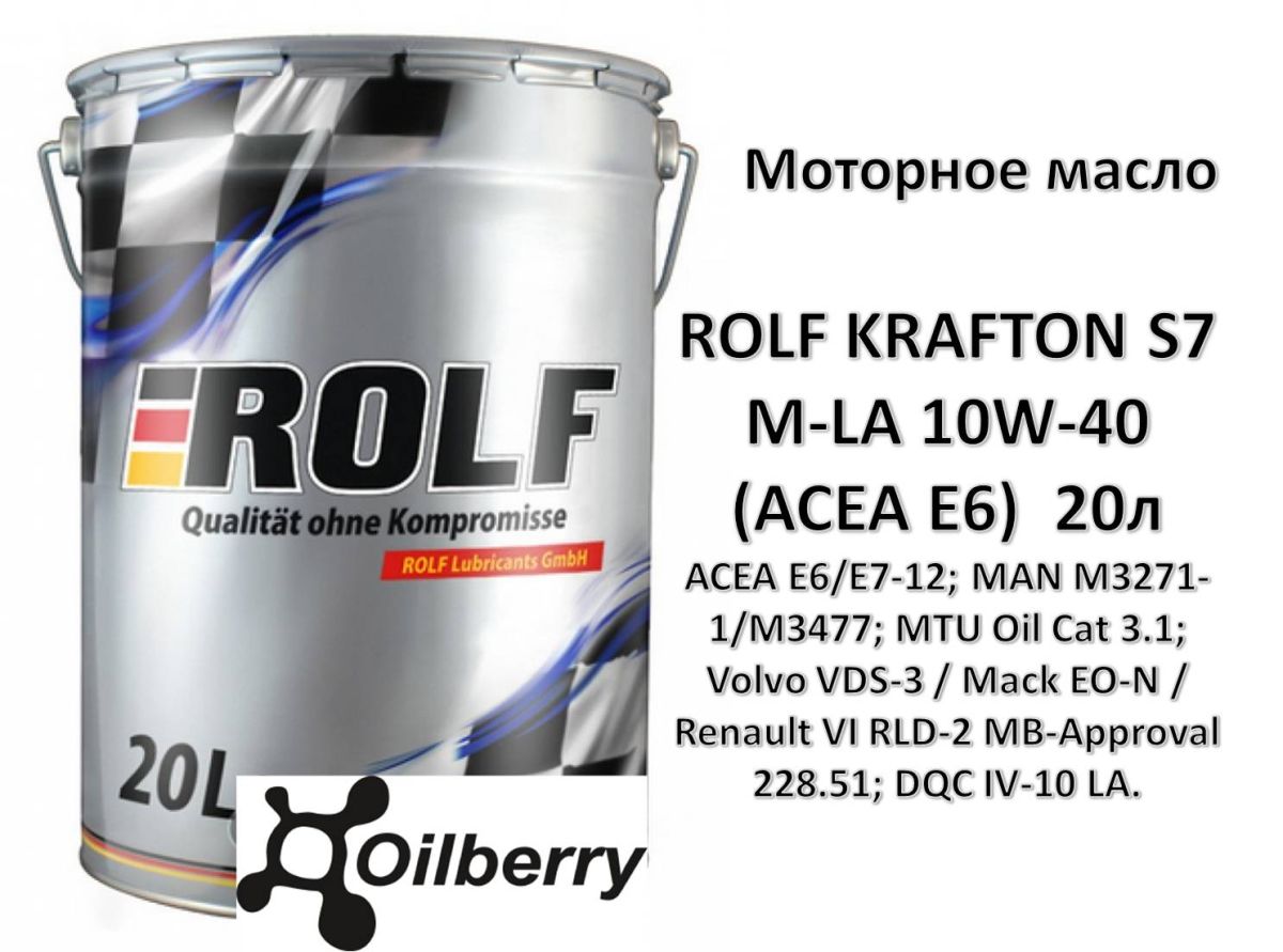 ROLF KRAFTON S7 M-LA 10W-40 разработано с учетом требований ведущих автопроизводителей. Предназначено для мощных дизельных двигателей коммерческого транспорта, автобусов, спецтехники экологического класса Euro-4, Euro-5 и некоторых Euro-6, с сажевыми фильтрами (DPF), включая технику, оснащённую системами EGR и SCR. Применяется в дизельных двигателях, использующих топливо с пониженным содержанием серы.