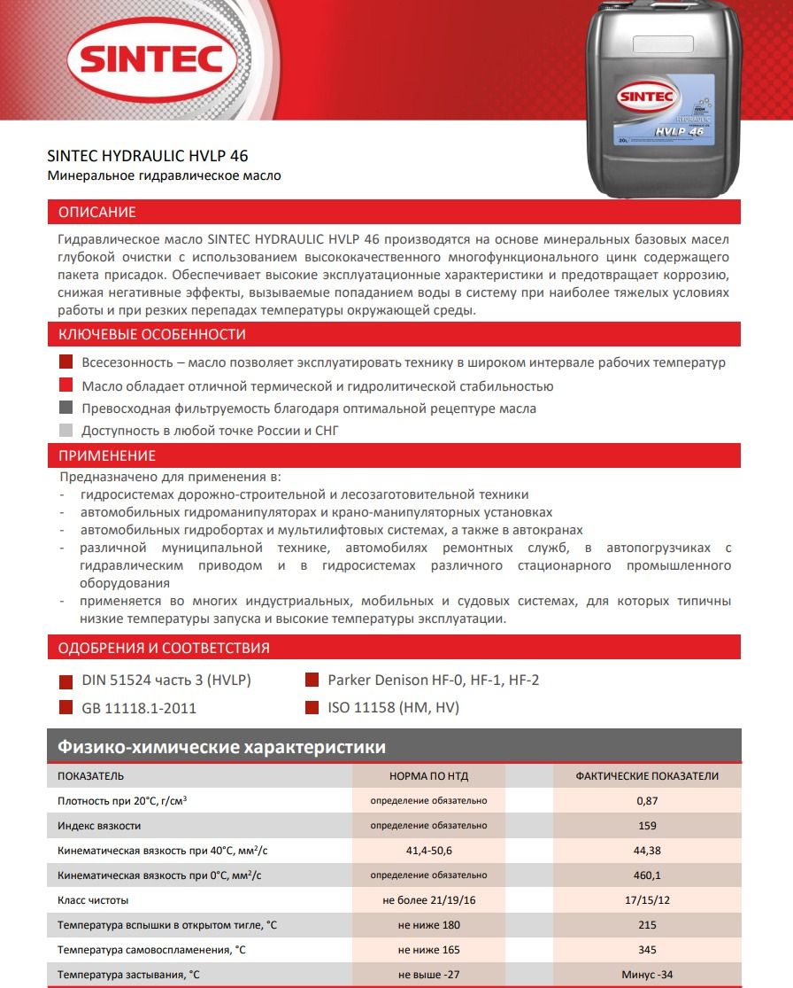 Гидравлическое масло SINTEC HYDRAULIC HVLP 46 производятся на основе минеральных базовых масел