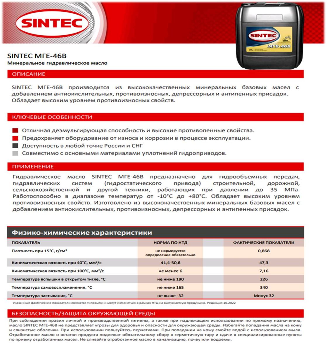 Гидравлическое масло SINTEC МГЕ-46В предназначено для гидрообъемных передач, гидравлических систем (гидростатического привода) строительной, дорожной, сельскохозяйственной и другой техники, работающих при давлении до 35 МПа.